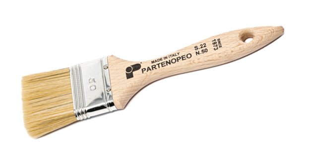 Setola bionda spessore mm.15, manico legno. Per applicazione di smalti e vernici a solvente, pitture murali ad acqua.