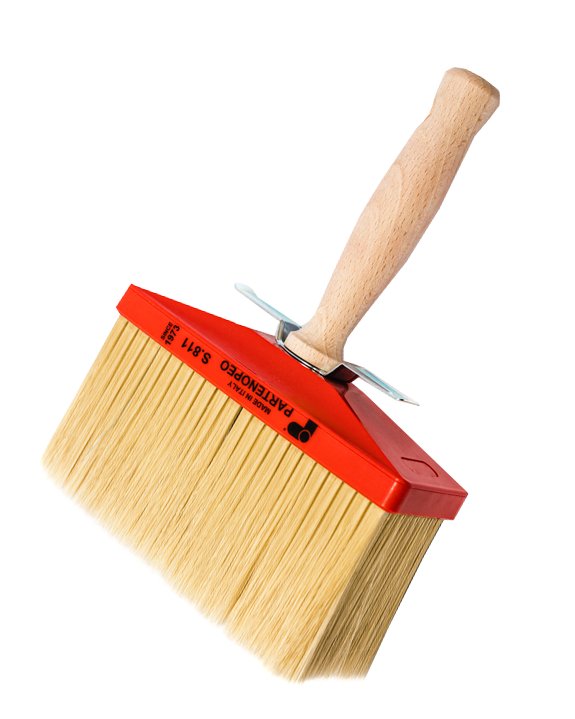 Antigoccia. Setola sintetica conica bionda a ciuffetti, assicella in resina, manico in plastica con inserto in gomma. Per applicazione di idropitture di qualsiasi tipo su superfici lisce.
