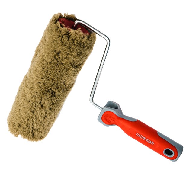 Professionale. In tessuto cordonato poliammidico verde scuro Ø 55, antisolvente, altezza pelo mm.20. Completo di manico in plastica con inserto in gomma. Indicato per idropitture su superfici ruvide sia per interni che per esterni.