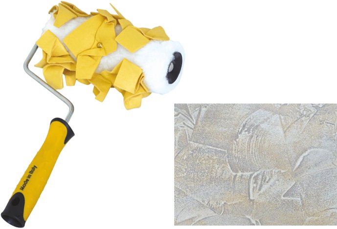 Rullo in tessuto poliestere e pelli sintetiche, completo di manico in plastica. Per applicazione di pitture decorative.