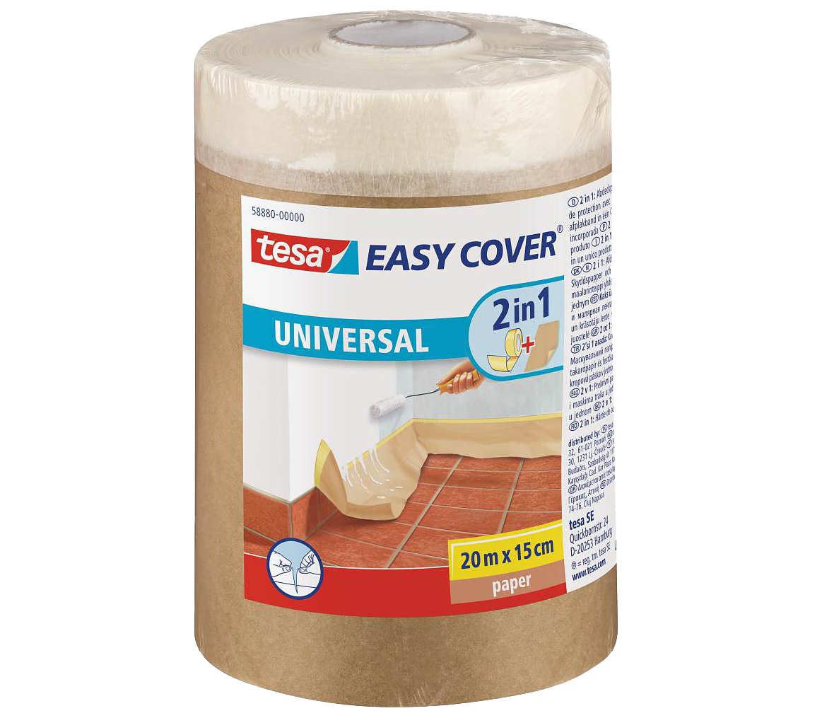 E' un telo protettivo ecologico in carta per pittori che combina un foglio in carta liscia per coprire grosse superfici con nastro per mascheratura auto-adesivo di facile applicazione. Il nastro auto-adesivo è attaccato ad un lato del foglio di carta e aderisce bene al muro o a qualsiasi altra superficie. Aiuta ad ottenere una pittura perfetta e bordi ben delineati mentre il foglio di carta protegge il pavimento e i mobili dagli schizzi di vernice. Buona adesione a quasi tutte le superfici. Adatto a tutte le pitture.