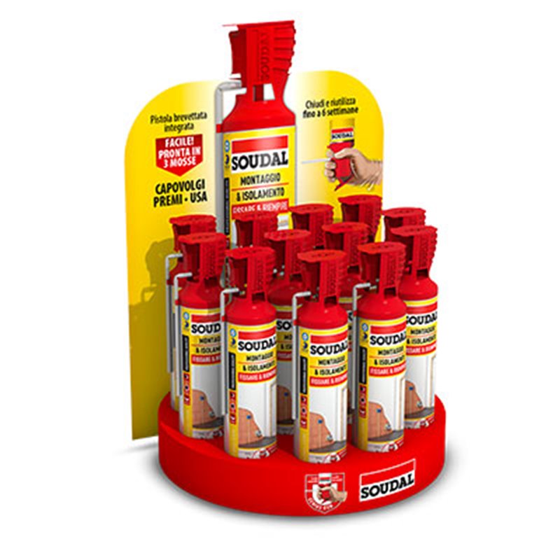 Espositore da banco. Contiente: 4 pezzi di schiuma poliuretanica 'Montaggio & Isolamento' (Cod. 5905602), 4 pezzi di schiuma poliuretanica 'Porte & Finestre' (Cod. 5905802), 4 pezzi di schiuma poliuretanica 'Pannelli & Blocchi' (Cod. 5906002). Dimensione: 37,5L x 32P x 55 H.
