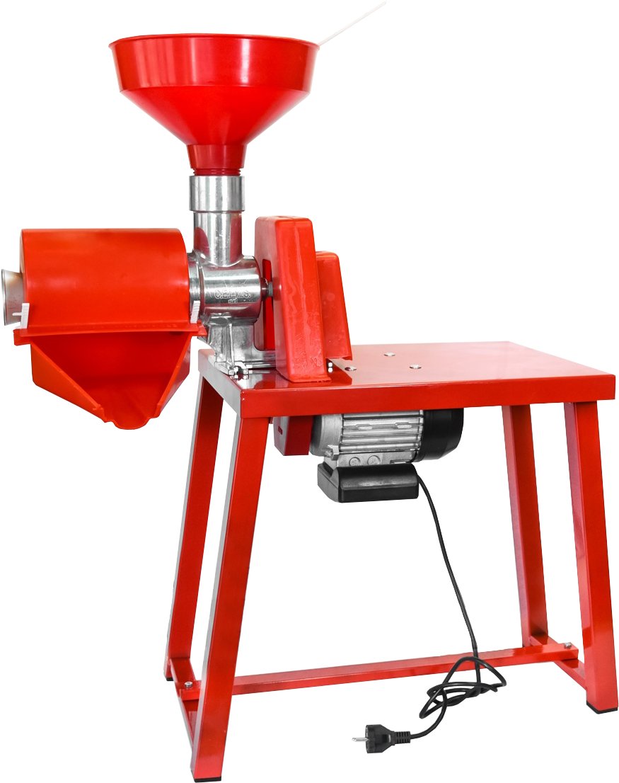 Motore asincrono monofase 230V/50Hz 4 poli, Potenza 370 Watt 0,50 HP Potenziato, Giri 1500 r.p.m. Corpo macchina e ghiera in alluminio pressofuso brillantato per alimenti, trasportatore a vite in poliammide, albero in acciaio, trasmissione con pulegge a cinghia trapezoidale, filtro in ferro stagnato, gocciolatoio in polipropilene copolimero per alimenti, imbuto e pestello in polipropilene ad alta densità, tavolo da lavoro in acciaio verniciato con polveri tipo epossipoliestere.