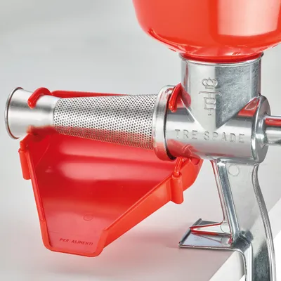 Spremipomodoro elettrico per le esigenze della famiglia e della piccola comunità taglia n° 3. Corpo in ghisa stagnata. Elica in resina certificata per uso alimentare. Giri dell'elica 160 r.p.m.. Tramoggia e collettore in moplen. Filtro stagnato. Motore da