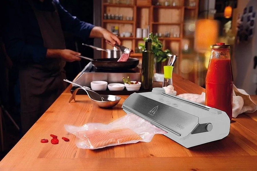 Struttura in ABS e inox. Motore 220V/50Hz. Barra saldante (larghezza 3 mm) ad altissima resistenza termica, lunghezza cm.33. Depressione massima 800 mbar, portata pompa del vuoto 16 l/min. Quattro diverse modalità di funzionamento: ciclo automatico - ciclo manuale - ciclo svuotamento vasi - ciclo sigillatura (per rotoli). Aspirazione da contenitori integrata sulla macchina. Permette di confezionare sottovuoto qualunque vaso in vetro con coperchio in metallo.