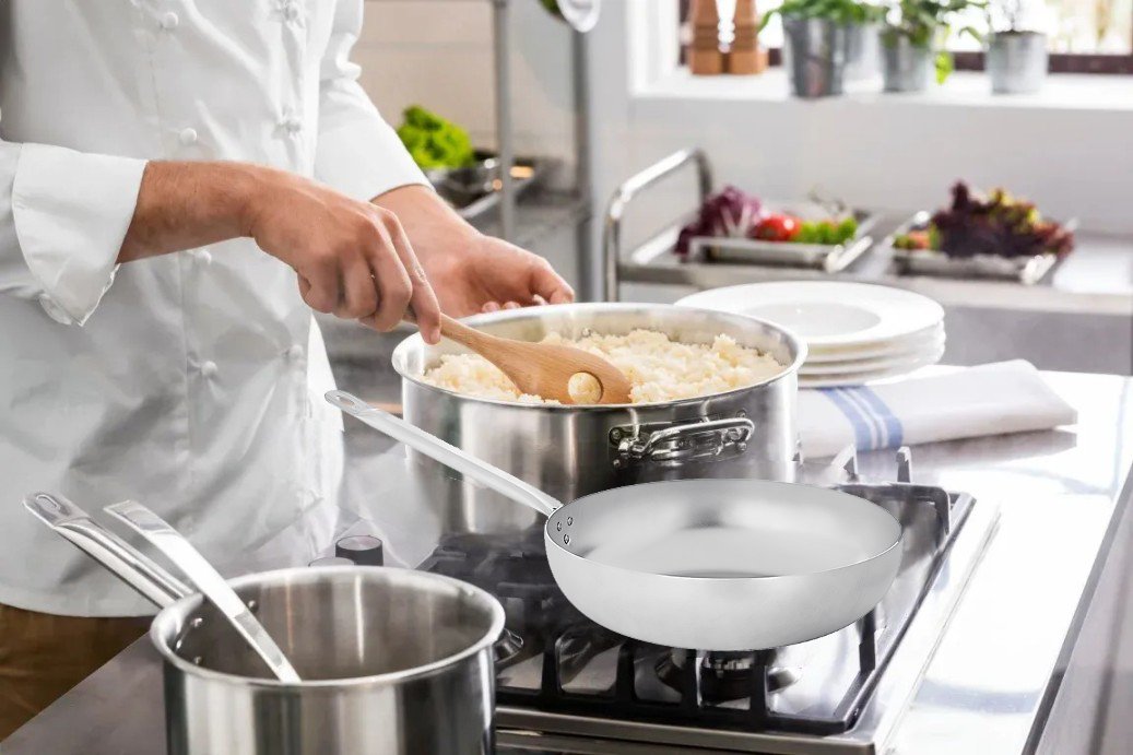 Materiale: Alluminio puro con finitura satinata. Manico in metallo. Spessore 1,5 - 2 mm.
