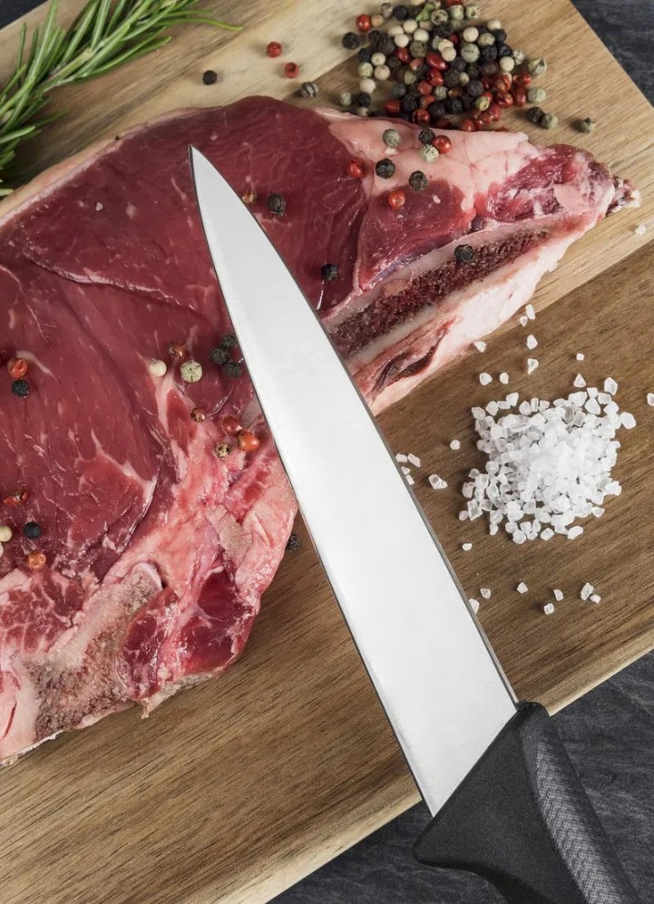 Lama in acciaio inox temperato, spessore 3 mm. Manico ergonomico in polipropilene antiscivolo.