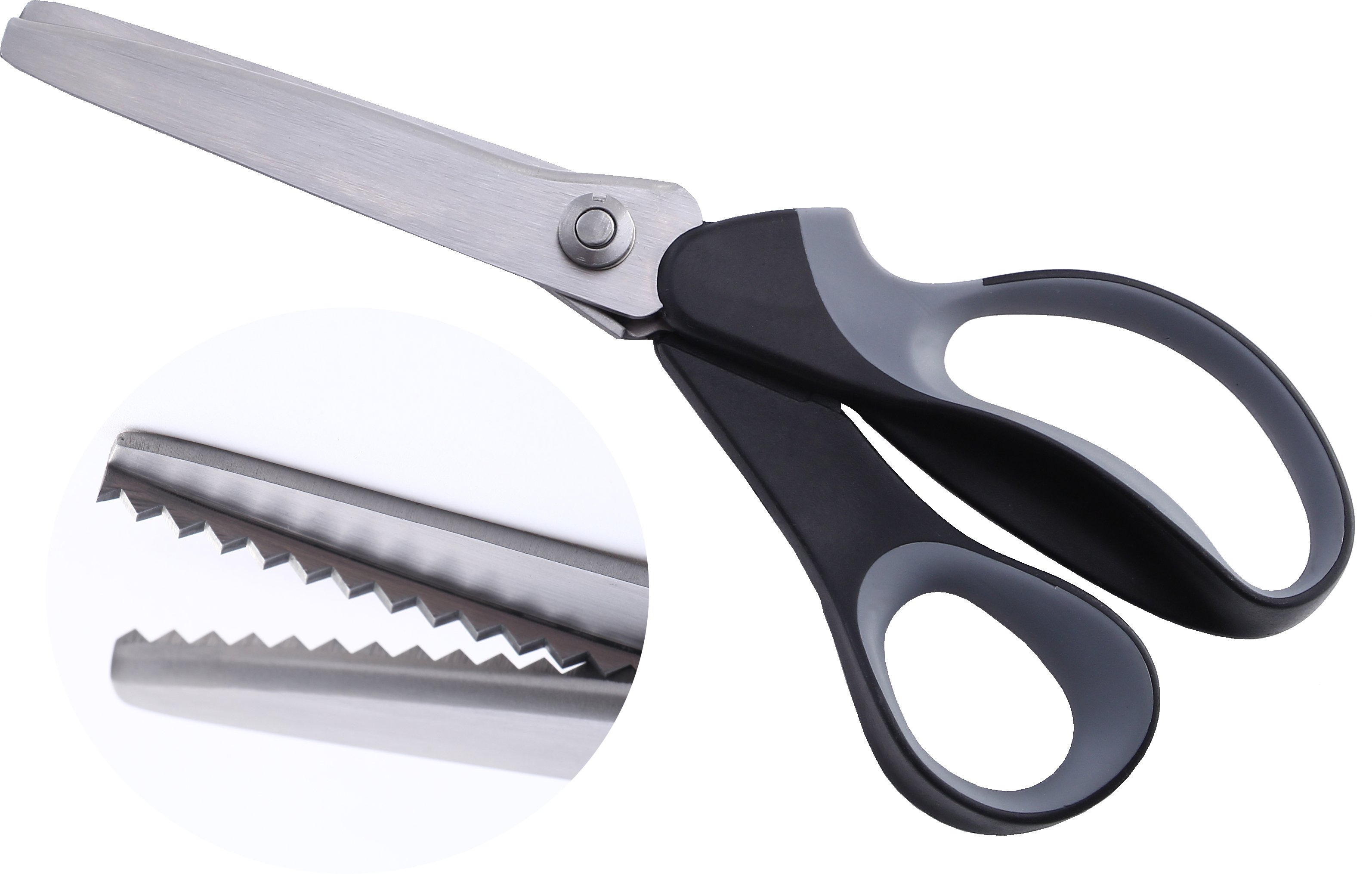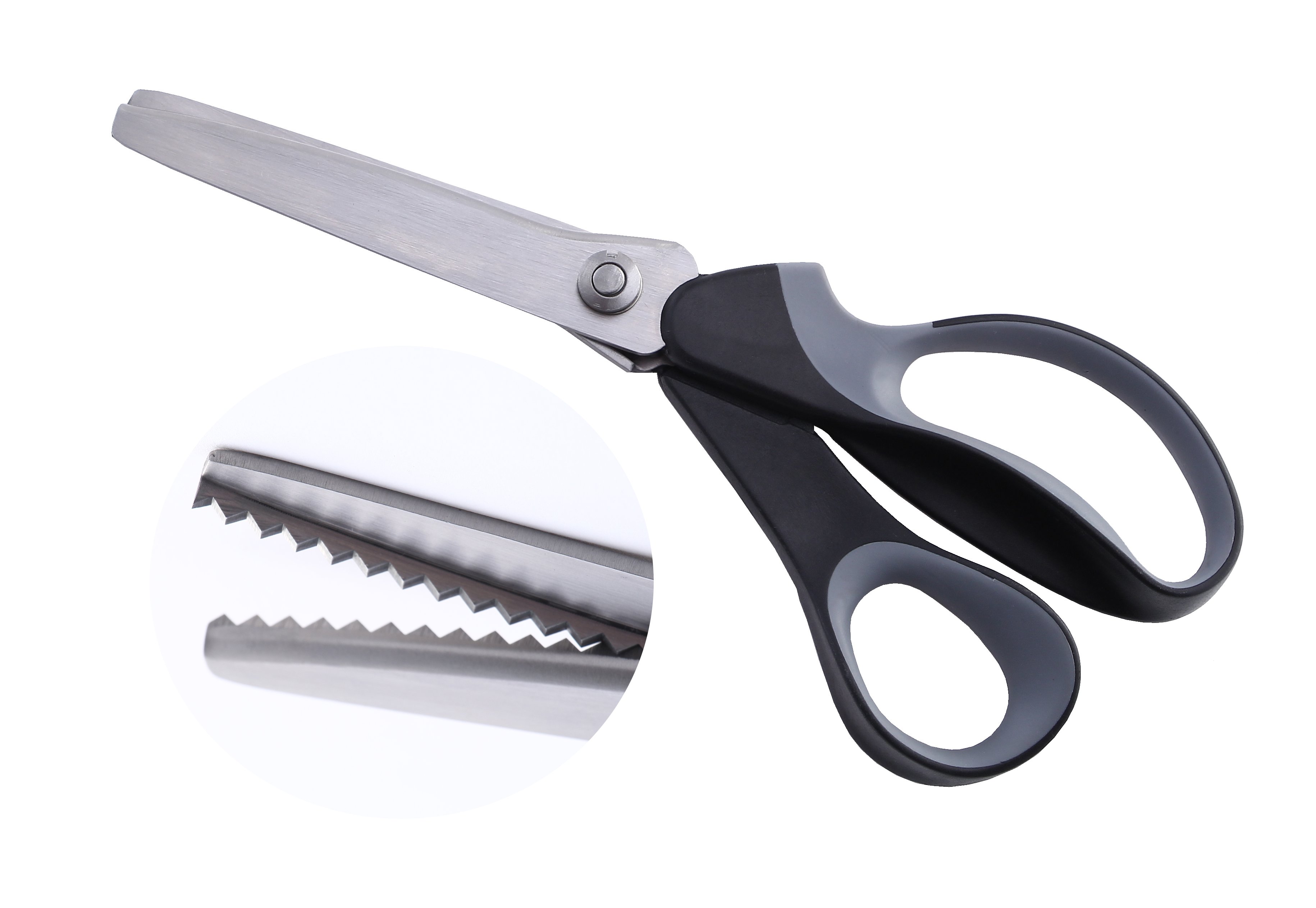 Lame seghettate in acciaio inox e impugnatura PP e TPE, in blister.