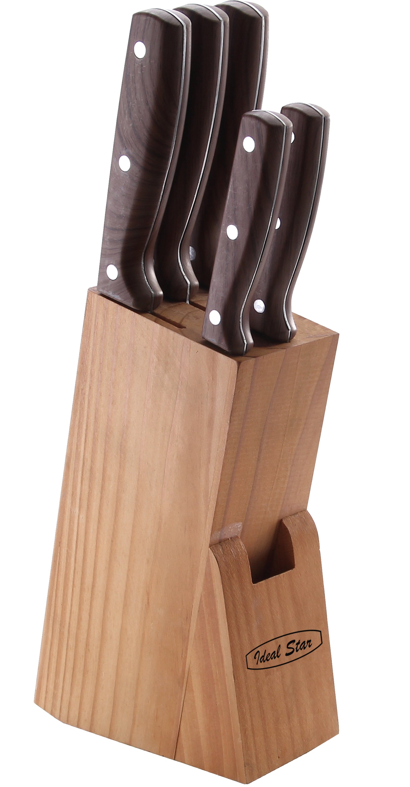 Ceppo in legno. Completo di 5 coltelli. Lame in acciaio inox.