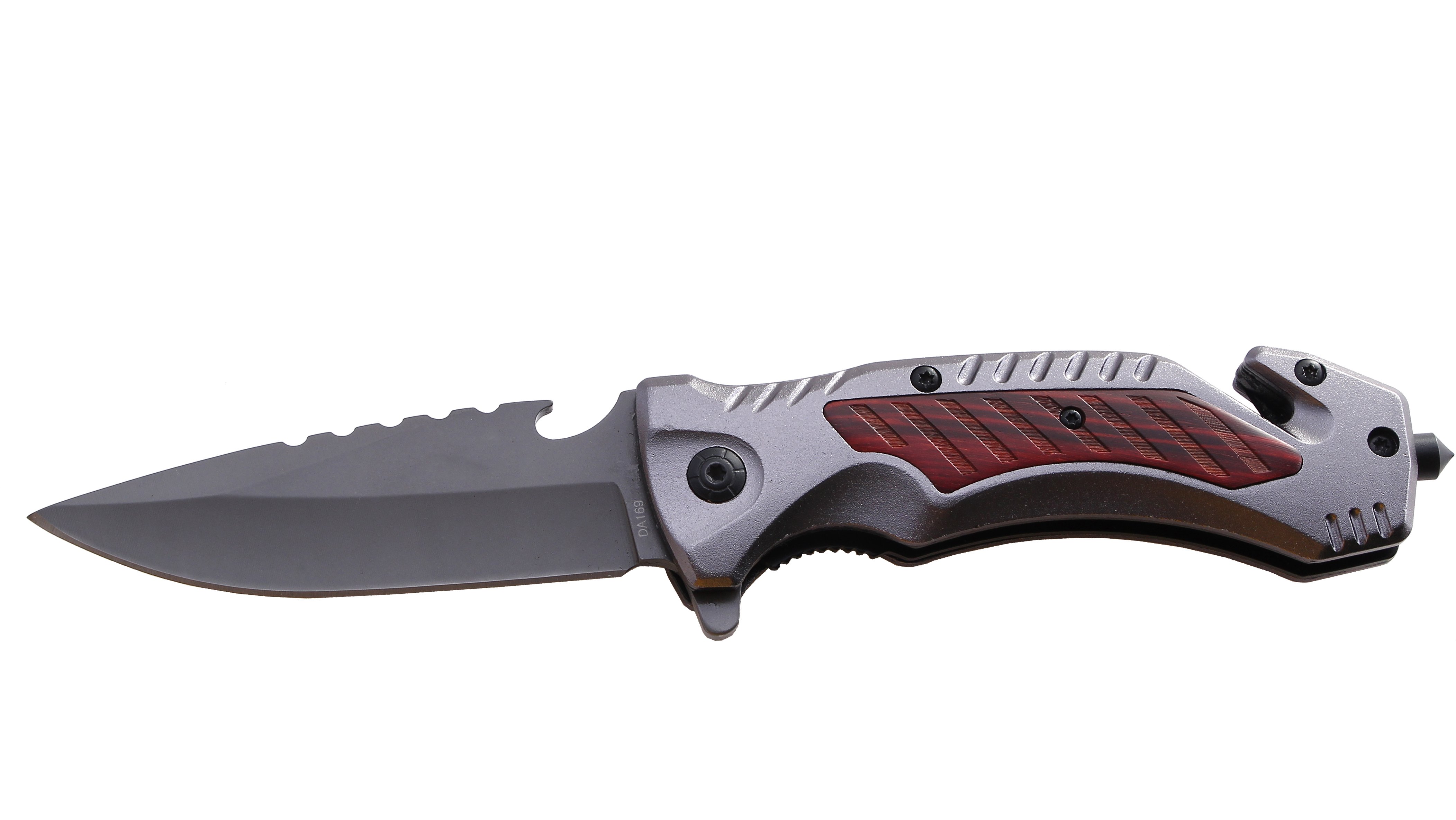 Lama in acciaio inox e manico alluminio con inserti in legno. In blister.
