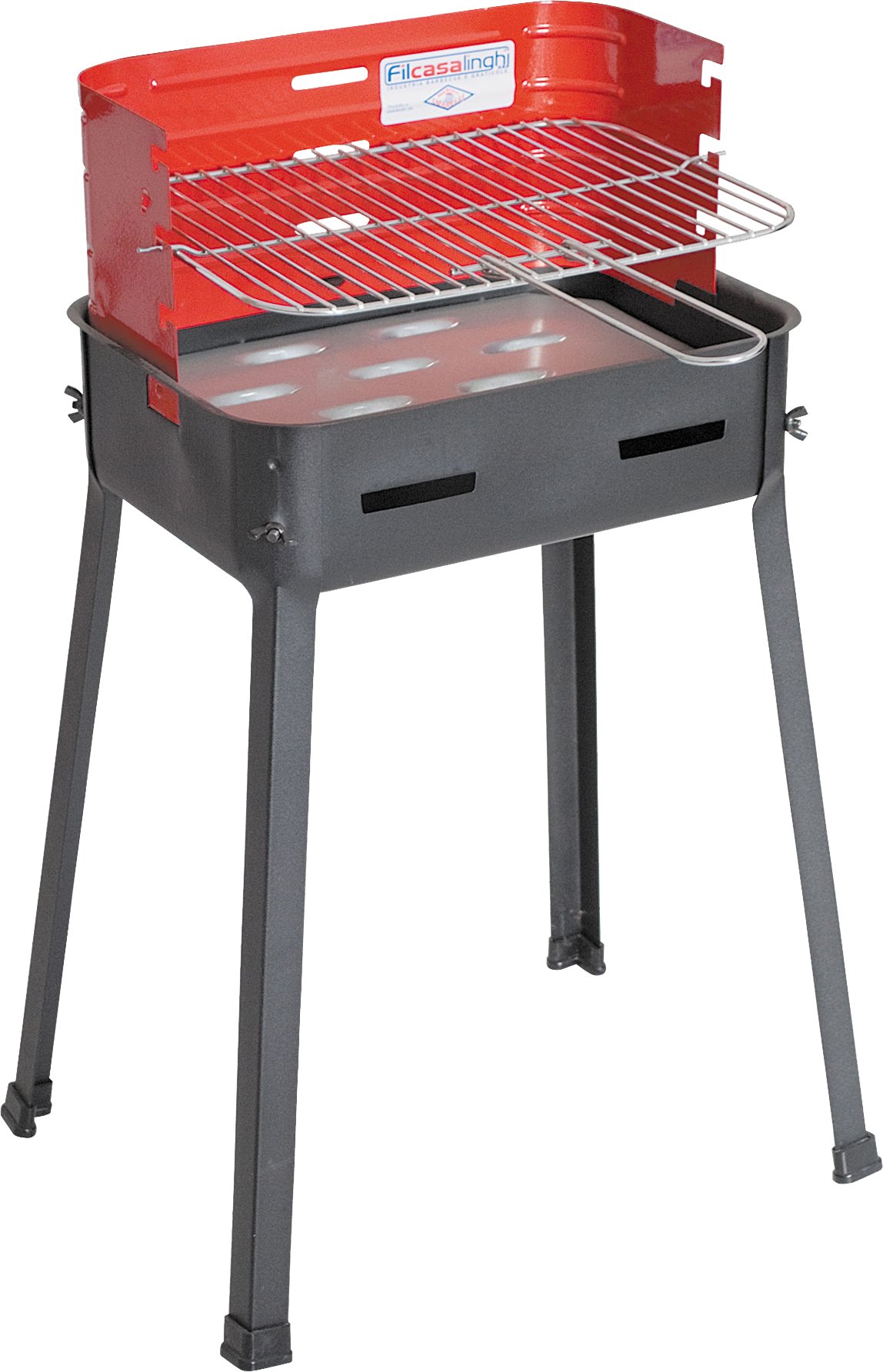 In acciaio verniciato e smaltato. Griglia di cottura in acciaio cromato regolabile in 3 posizioni. Paravento in acciaio verniciato. Gambe fissate con viti a farfalla.