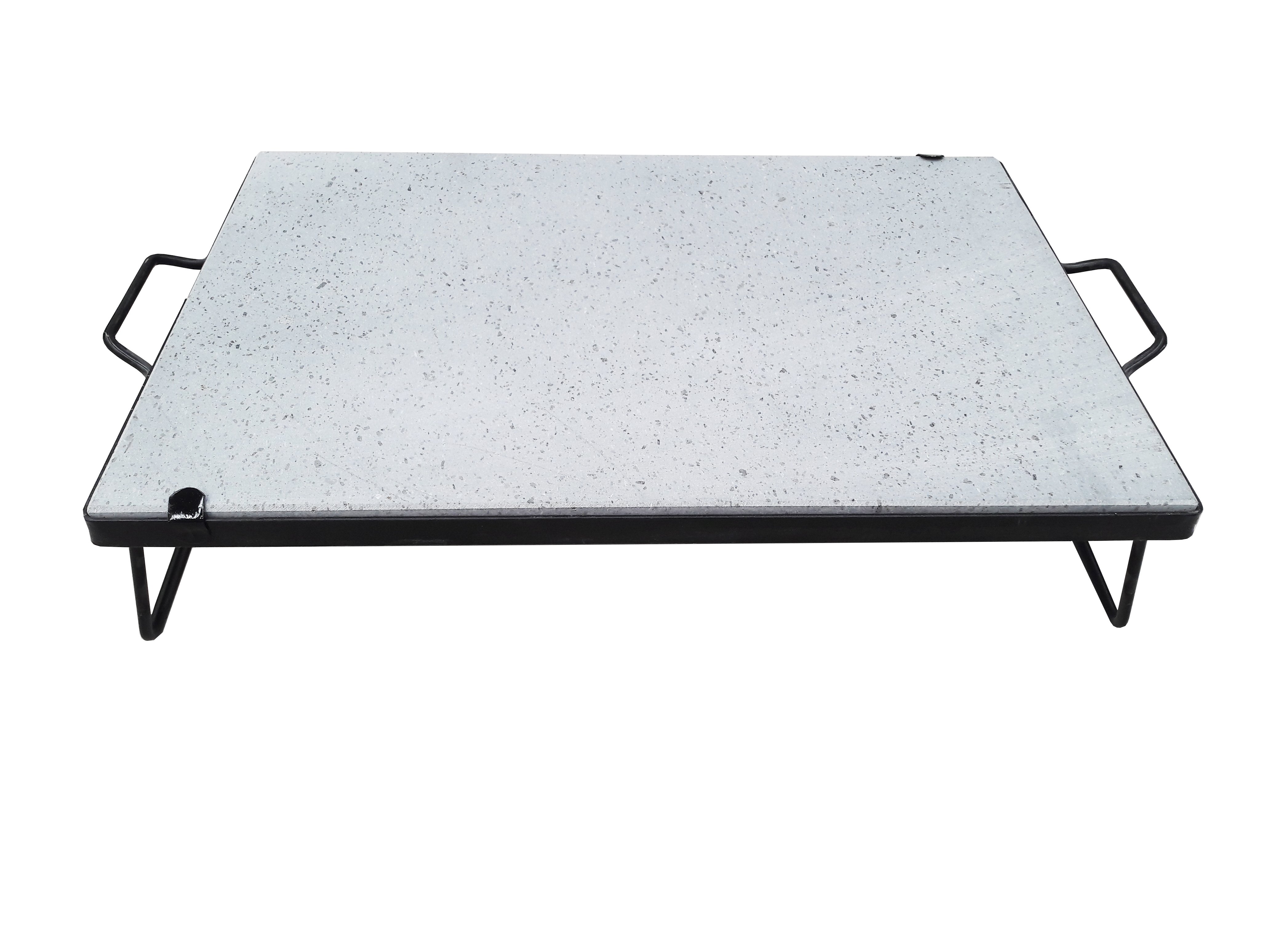 Pietra vulcanica ad uso alimentare dello spessore di 2 cm. Bisellata sui lati con scanalatura 'raccogli grassi'. Telaio in ferro con manici fissi e con piedi sia richiudibili che estraibili.