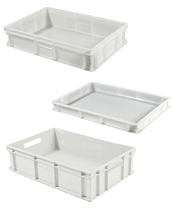 Fondo e pareti piene. Materiale: PEHD (polietilene alta densità). Sovrapponibili ed impilabili. Temperatura esercizio: -20°C/+80°C. Idoneo al contatto con alimenti.
