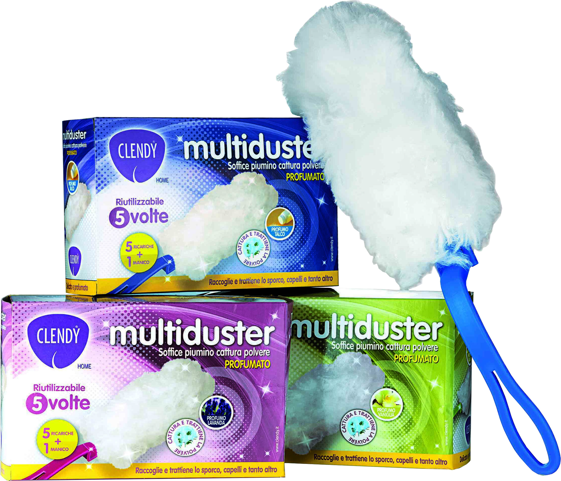 Soffice, delicato e profumato piumino catturapolvere. Il piumino aiuterà ad eliminare ogni traccia di polvere da qualsiasi superficie, grazie all'elevato potere elettrostatico delle fibre che lo compongono. E' dotato di manico, pratico e funzionale, che consente di raggiungere anche i punti più difficili e impraticabili. Profumazioni assortite. Il delicato profumo in cui sono impregnate le fibre, garantisce un risultato di pulizia ottimale senza fatica.