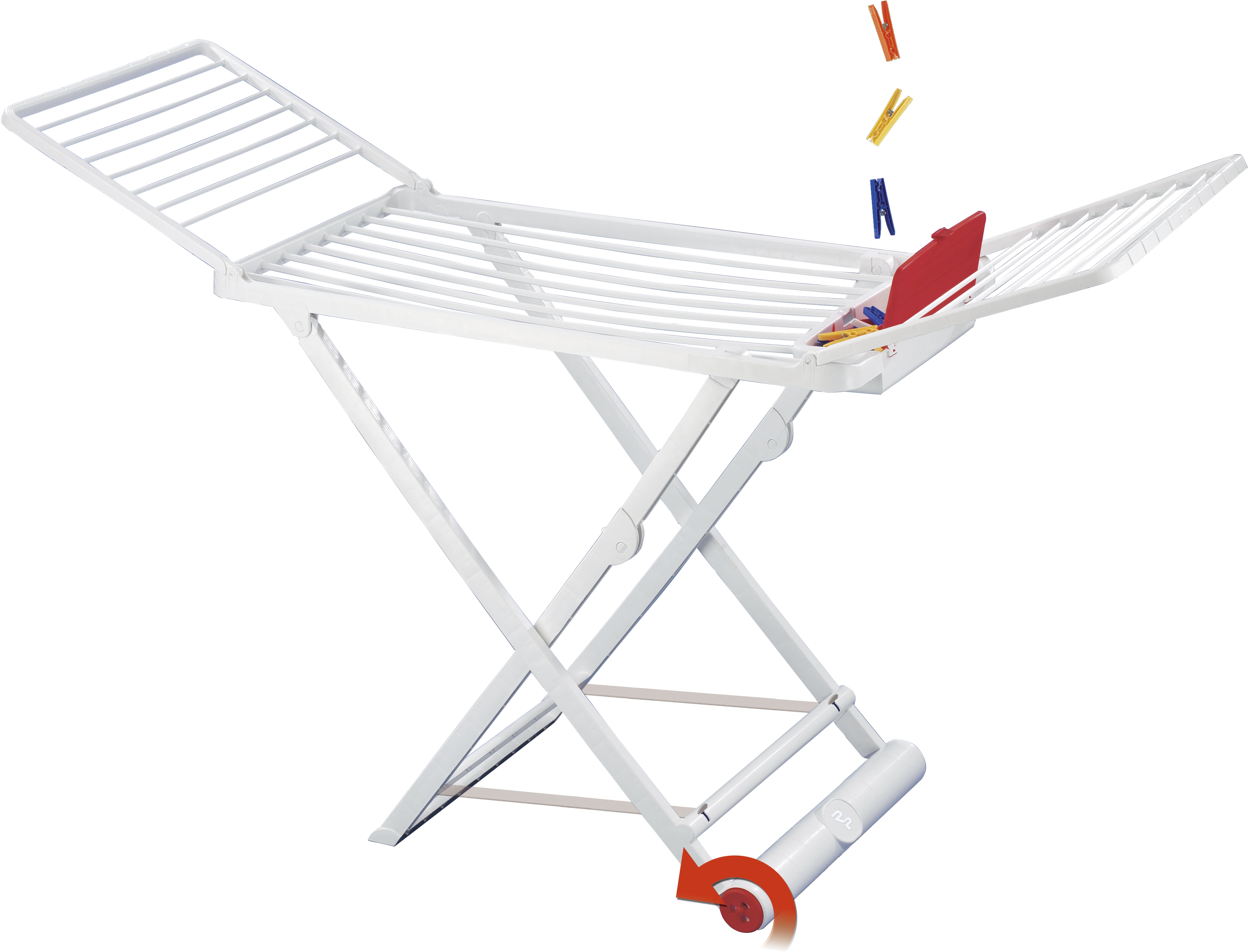 Realizzato interamente in resina. Provvisto di ruote e vaschetta porta mollette. Lunghezza totale di stenditura 20 metri.