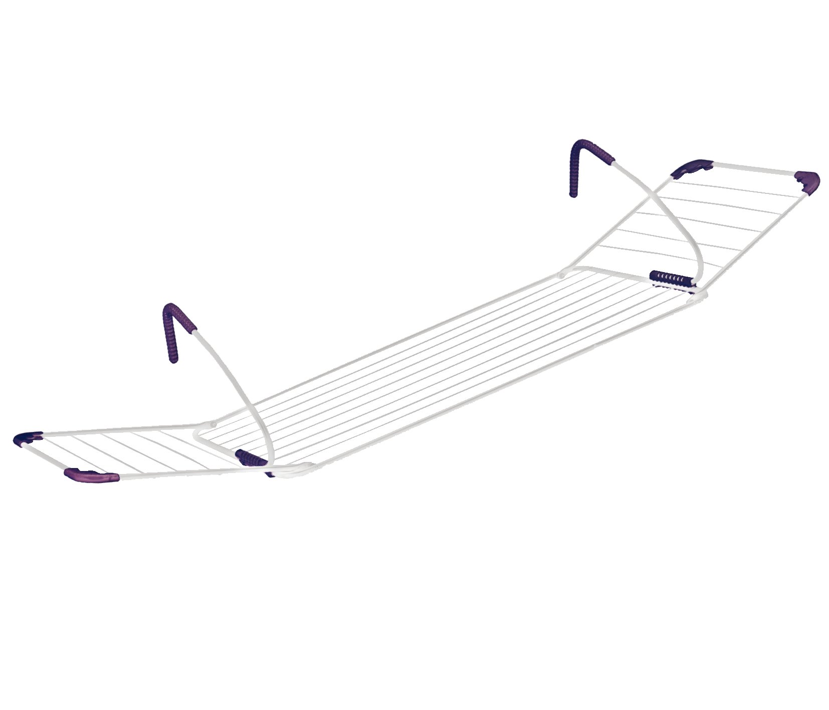 Stendibiancheria da balcone in acciaio verniciato antiruggine con ali pieghevoli. Bracci regolabili e protezione in plastica. Lunghezza totale di stenditura 18 metri.