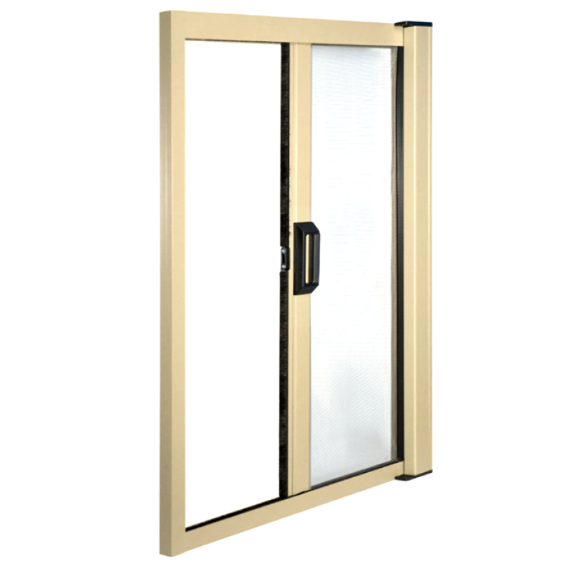Zanzariera in tessuto tecnico di fibra di vetro e pvc colore grigio e struttura in alluminio con ingombro di soli 40 mm. Le misure massime di larghezza e di altezza possono essere ridotte e adattate alla finestra con un semplice taglio del prodotto direttamente sul posto. Zanzariera con movimento orizzontale del tessuto a scomparsa nella struttura in alluminio. Facile da installare, risulta molto gradevole esteticamente. Soluzione permanente e duratura, viene applicata direttamente sul muro o sulla finitura esterna alla porta senza modificare la struttura esistente. ideale per porte in genere, porte finestre in genere, porte finestre con tapparelle, porte finestre con scuri, porticati, verande, balconi, porte di camper, porte di roulotte, porte e porte finestre di bungalow, porte e porte finestre di case mobili, gazebo, porte e porte finestre di case o casette in legno.