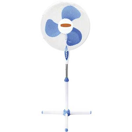 Alimentazione 220V/50Hz, 45 Watt. Corpo in plastica, griglia di protezione in metallo, supporto a crociera con colonna regolabile in altezza (H. max cm 130). 3 velocità, oscillazione orizzontale, inclinazione verticale regolabile.