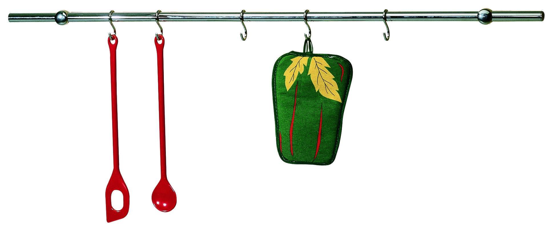 In acciaio. Composto da: asta Ø 16 mm, terminali, supporti rotondi, 6 ganci a S, viti e tasselli di montaggio.