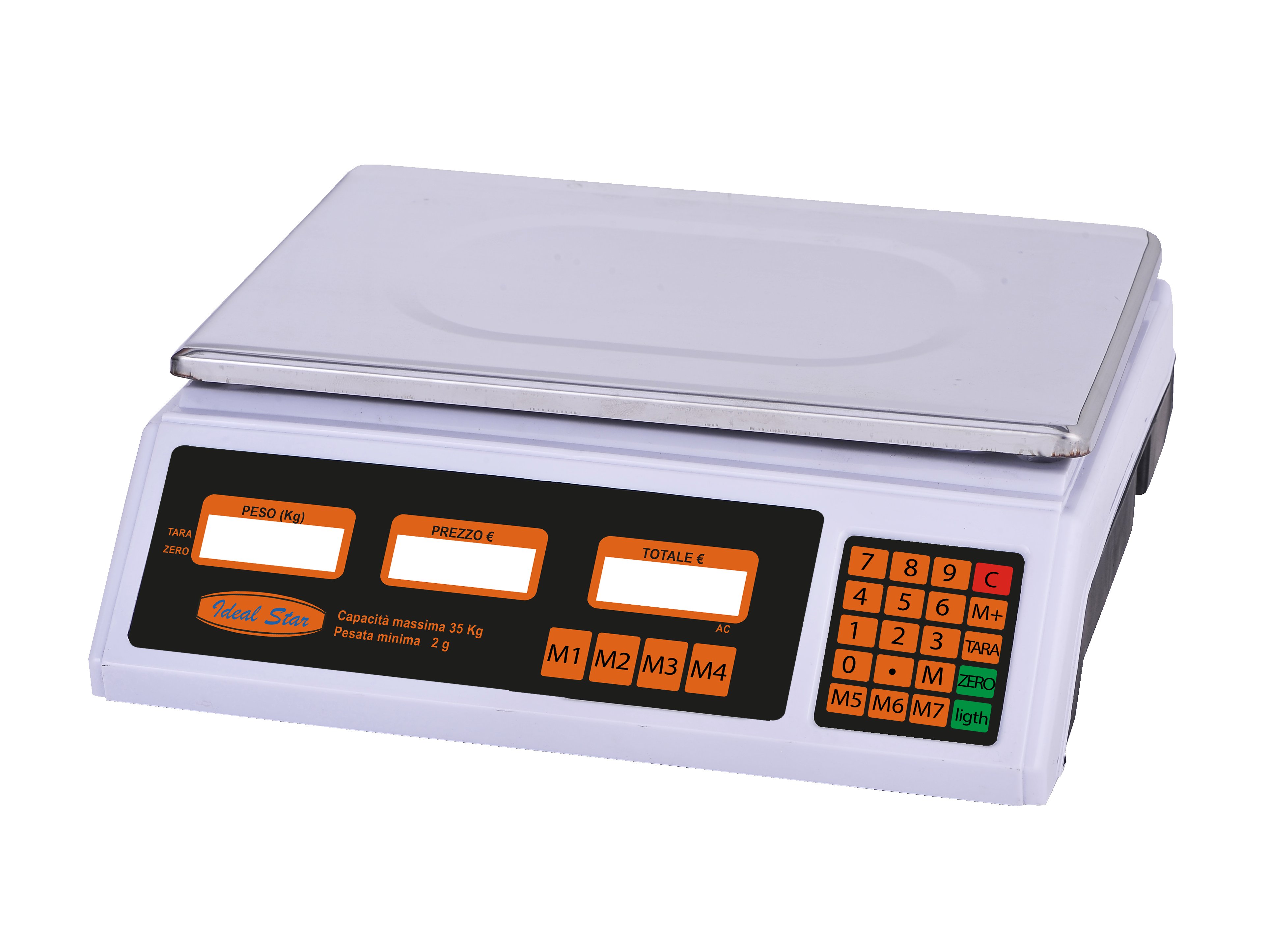 Dotata di display LCD con funzione del calcolo del prezzo e capacità di memorizzare fino a 7 prezzi unitari. Alimentazione 220V/50Hz e batteria ricaricabile integrata 4V 6A. Capacità massima 35Kg. Minimo 2gr. Piatto in ferro 33x23. Adatta per uso domestica.