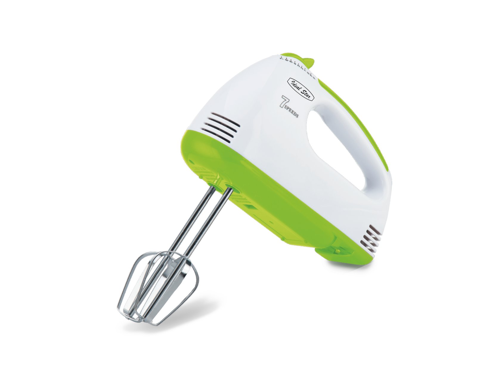 Mixer con 7 velocità, 1 paio di fruste per montare e 1 paio di ganci per impastare in acciaio inossidabile facile da pulire. La protezione automatica contro il surriscaldamento lo rende più sicuro e protetto.