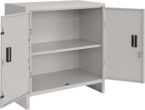 Componibile. In lamiera d'acciaio pressopiegata o profilata a freddo con rivestimento superficiale di finitura verniciato con polveri epossidiche. Con cerniere interne antiscasso, 4 ripiani antitaglio, serratura a cilindro con doppia chiave in dotazione. Colore grigio.