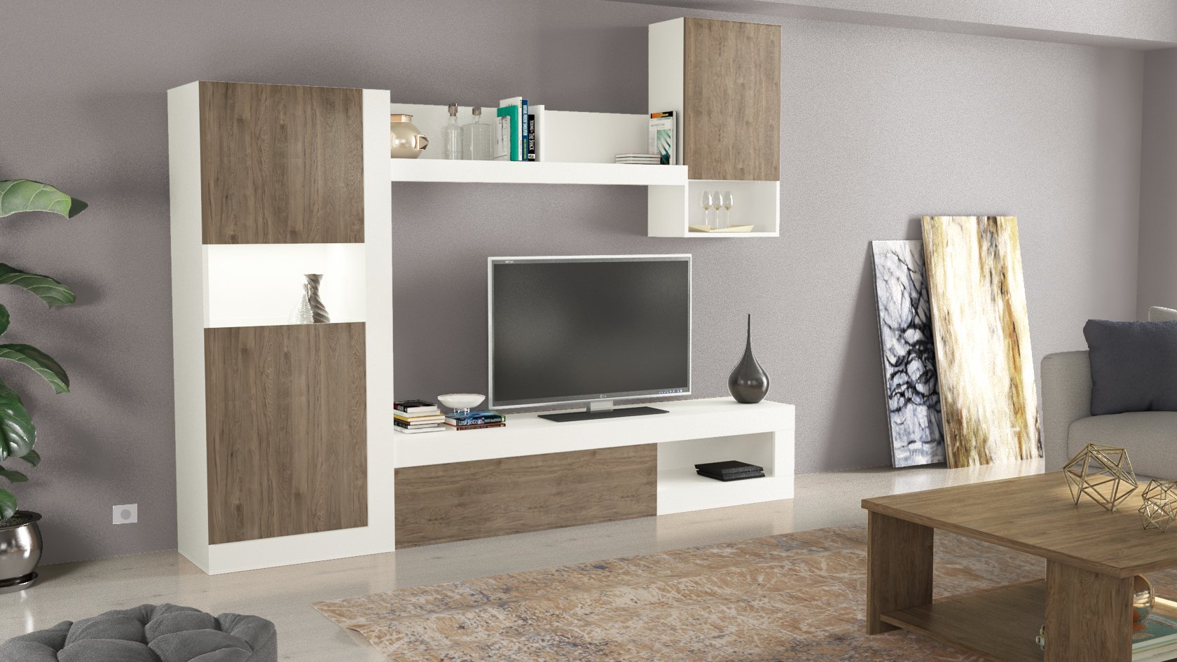 Materiale: Truciolare nobilitato melaminico antigraffio. Spessore: 16 mm. Soggiorno composto da pensile, scaffale, colonna bassa, cassettone e vani a giorno. Apertura a presa.