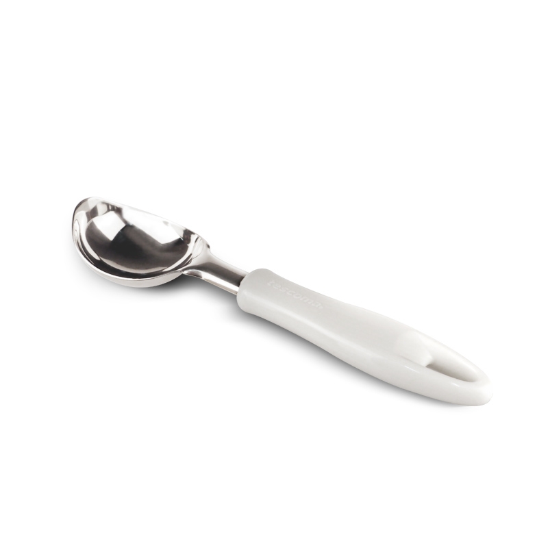 E' a cucchiaio, prodotto in acciaio inox di prima qualità e plastica bianca resistente, per ottenere palline perfette.