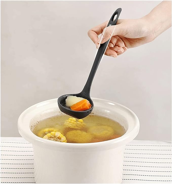 Mestolo in nylon, particolarmente indicato per pentolame con rivestimento antiaderente poiché non ne danneggia la superficie. L'utensile è immune all'attacco degli acidi, non assorbe né odori nè colori degli alimenti. Resistente al calore fino a 210 °C.