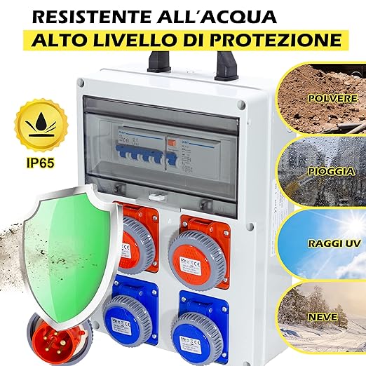 Il quadro è dotato di cavo da 2 Mt 5*2.5mm2 con una spina 3P+N+T 16A 380V IP67, due prese CEE 16A 2P+T 230V IP67, 2 prese 3P+T 16A 400V IP67, pulsante di emergenza, interruttore magnetotermico 3P 25A e differenziale 3P 25A 0,03A