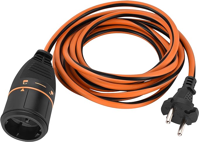 Permette di lavorare in maniera agile e confortevole impedendo disconnessioni accidentali dell’apparecchio collegato durante il suo utilizzo grazie al sistema 'Electralock' (Solleva un peso pari a 12Kg senza rovinare la spina inserita). Cavo H05VV-F, 16A-250V, 3G1,5 mm². Colore nero/arancio.
