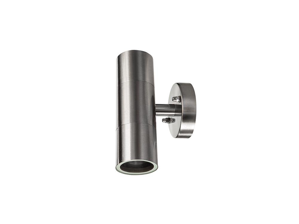 Corpo in acciaio. Diffusore in vetro trasparente. Portalampade GU10. Alimentazione max 2x35W. Grado di protezione IP44. Dimensioni Ø mm.60x110x180.