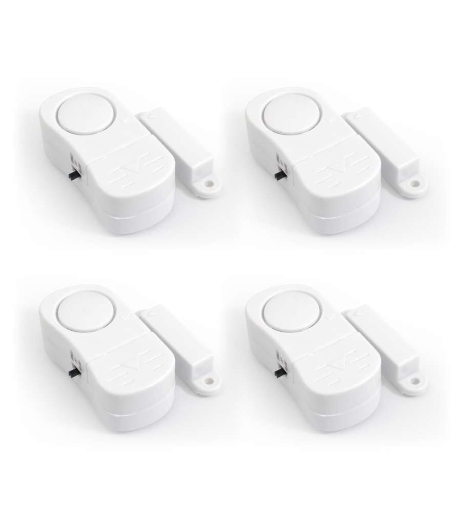 Kit composto da pratici 4 mini allarmi, ideali per porte e finestre, funzionanti a contatto magnetico integrato. Sirena integrata 100dB. Funziona con 3 batterie 1,5V (mod. LR44 in dotazione). Possibilità di selezionare la funzione campanello con semplice suoneria Din Don.