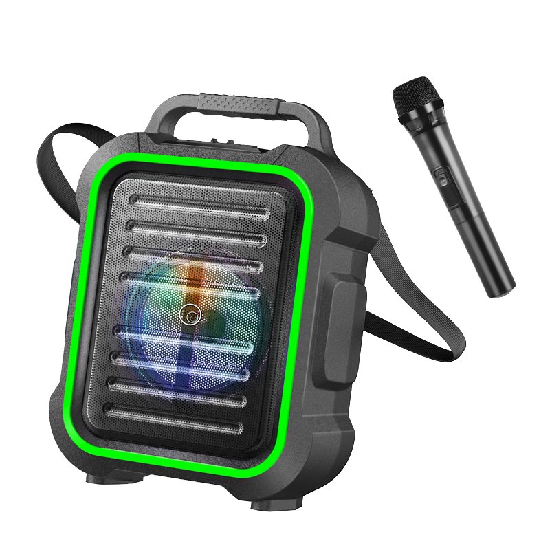 Altoparlante Wireless con microfono. Modalità di riproduzione: Wireless, USB, AUX, Scheda SD. Riproduce audio MP3, batteria ricaricabile. Funzione Karaoke, luci LED RGB sincronizzate. Versione Bluetooth: Bluetooth 5.0. Gamma di frequenza: 2,4 GHz. Campo di lavoro: 10 metri. Riproduzione musicale: 2 ore. Tempo di ricarica: 1-2 ore. Contratto di supporto: A2DP. Risposta in frequenza: 45Hz-20KHz. Unità altoparlante: 6,5 "16,51 mm 4Ω15 W. Capacità della batteria: 2200 mAh.