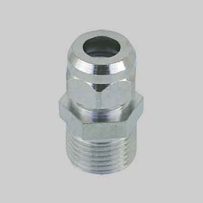 In ottone cromato. Maschio diritto, con dado conico, per cannette.