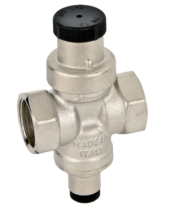 In ottone nichelato. Funzionamento a pistone, sede in ottone, attacchi filettati F.F. PN16, campo di taratura 1-4 bar.