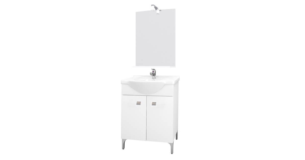 Composto da: lavabo in ceramica da cm 55, base sospesa con due ante, maniglia porta salviette in metallo, specchio completo di illuminazione a led.