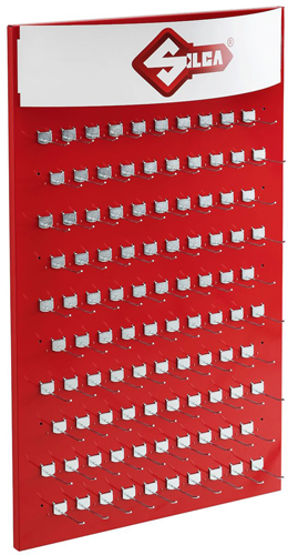 Da parete con struttura in acciaio e completo di 100 ganci. Flessibilità nella posizione dei ganci, massima versatilità di utilizzo e misure facilmente adattabili alla maggior parte dei moduli di arredamento presenti nel mercato. I fori dell'espositore sono compatibili con tutti i tipi di ganci Silca.