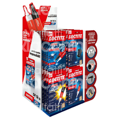 Pratico expo da banco in cartone. Contenuto: Loctite super attak 'All plastic' pezzi 6, Loctite super attak 'Original' 3 gr pezzi 18, Loctite super attak 'PowerGel' 3 gr pezzi 6, Loctite super attak 'EasyBrush' 5 gr pezzi 6.